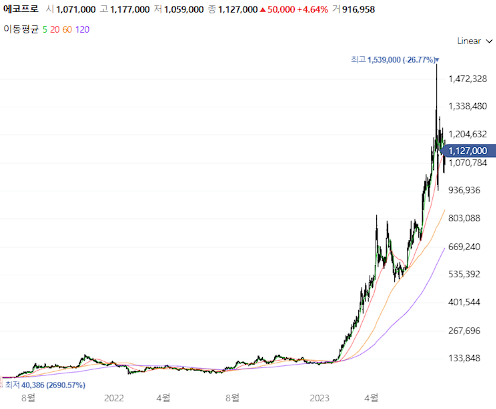위의 차트는 네이버 증권에서 본 에코프로 차트인데 주가 차트를 자세히 살펴보면 정말 쭉쭉 상승합니다.